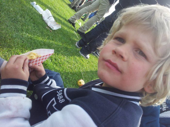 We zijn in het Stadspark op het grote muziekterrein. Lekker suikerspin eten met Luc en Yaro.