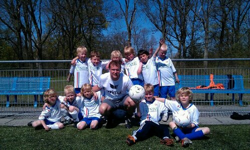 Teamfoto van team 4 met trainer Erik.