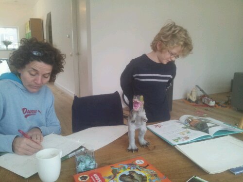 Met mama mijn spreekbeurt voorbereiden voor morgen. Ik ga het doen over dino’s.